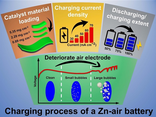 An in-depth study of the gas evolution process on the air electrode was carried out by in-situ characterization. The results show that the charging process can be divided into three typical stages, and at lower current densities and extents of discharge/charge, the air electrode can always maintain a "self-cleaning" state to be free of bubbles. This work provides an understanding of the charging behavior on the air electrode, promoting the practical development of metal-air batteries.