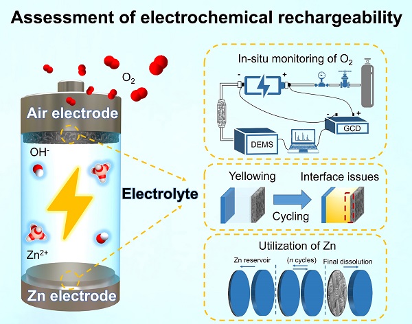 In this work, the electrochemical rechargeability of alkaline aqueous Zn-air batteries is critically evaluated, firstly for the polarization curves of conventional scanning tests, achieving a relatively stable individual voltage test method to provide an effective complement to the more transient conventional scanning tests. Then a comprehensive investigation was performed for each component of the cell (Zn electrode, air electrode, electrolyte), including in situ monitoring of oxygen released during charging, utilization of the Zn electrode, and characterization of the electrolyte and electrode-electrolyte interface changes.