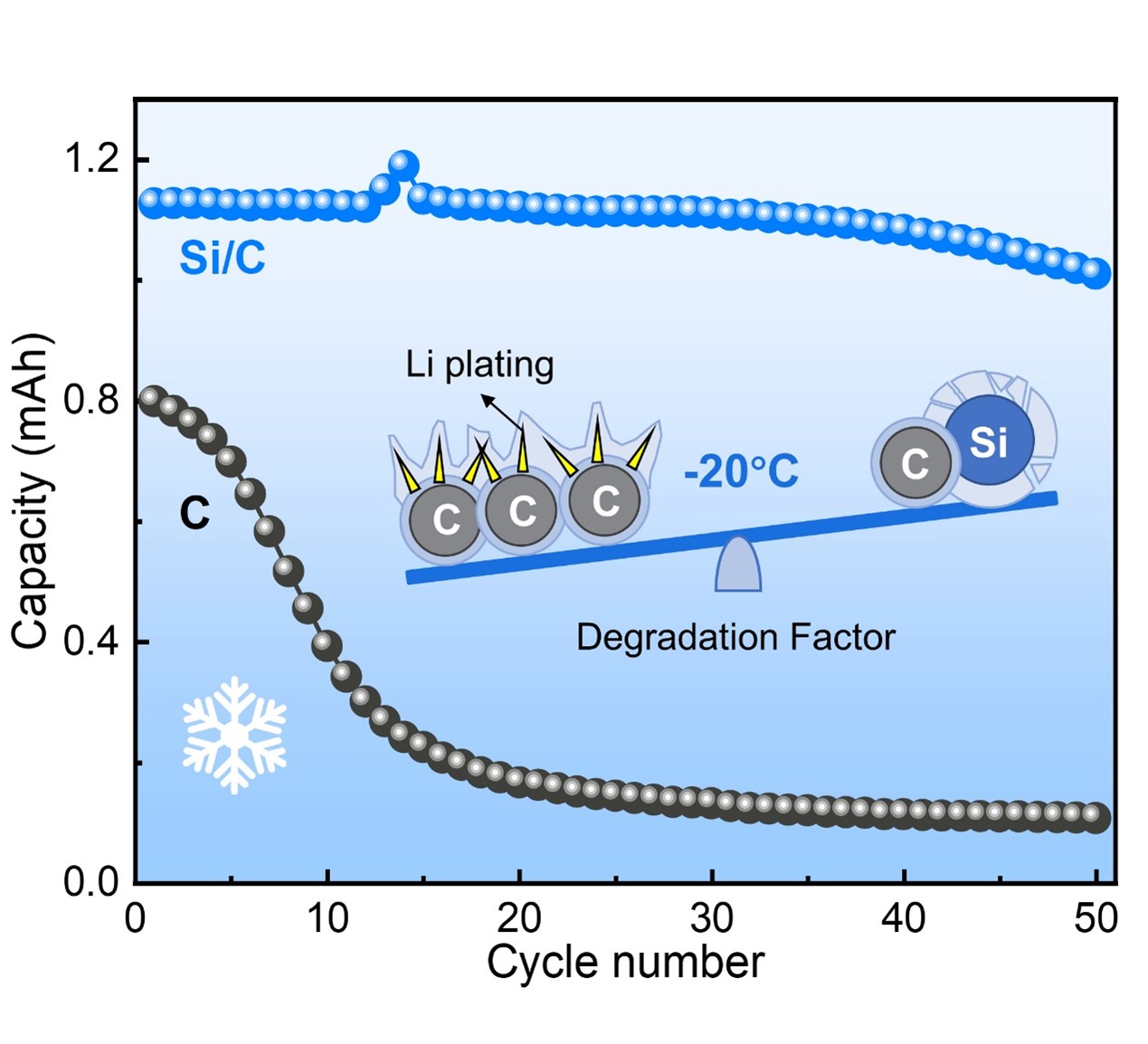 In this work, a significant performance enhancement of silicon-carbon (Si/C) batteries at low temperatures (-20 °C) was unexpectedly discovered, and the low-temperature modification mechanism of Si on the anode was investigated. This work provides an effective strategy for the stable operation of lithium-ion batteries at low temperatures, and more in-depth mechanistic studies will promote the application of lithium-ion batteries in extreme temperatures such as in space and the deep sea.